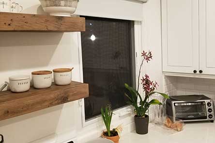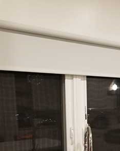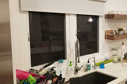 The consultation team determined that the old hand-drawn shades’ housing needed to come out, which our technicians did before attaching the new roller and motor for these mauve vinyl shades. Syncing, programming, and testing for the remote control and timer went without a hitch.